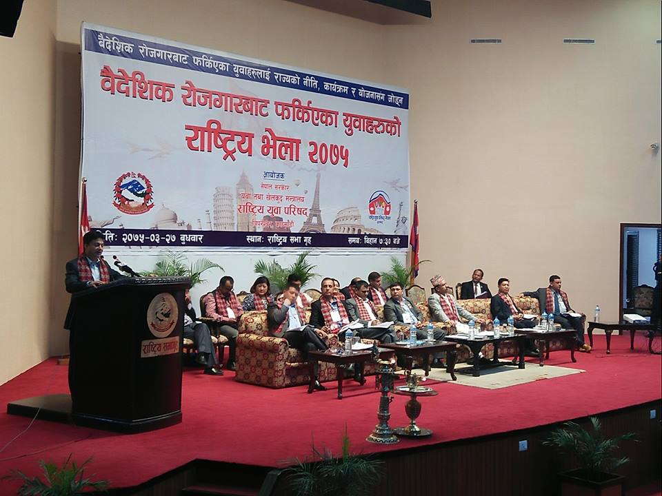 काठमाडौ । वैदेशिक रोजगारीबाट नेपाल फर्केकाहरुलाई राज्यको निति तथा कार्यक्रमसँग जोडने उदेश्यले राष्ट्रिय भेला आज काठमाडौको राष्ट्रिय सभागृहमा नेपाल सरकार युवा तथा खेलकुद मन्त्रालय राष्ट्रिय युवा परिषदको आयोजनामा भएको छ ।