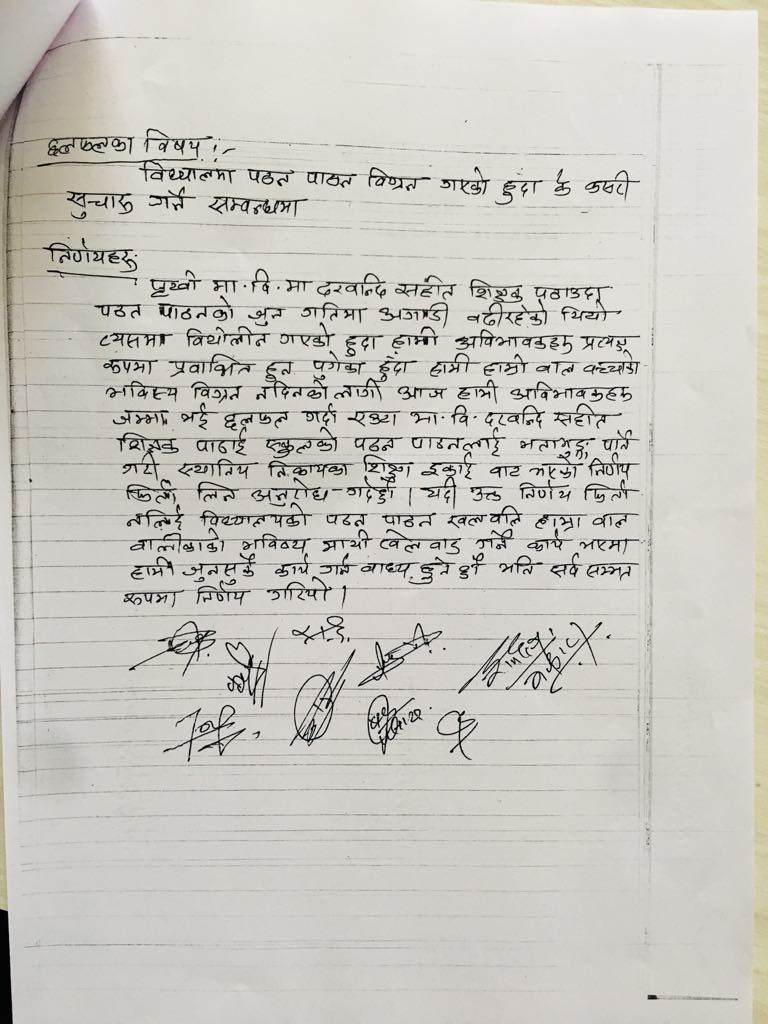 आक्रोशित अभिभावकको समुहलाई सम्बोधन गर्दै नगरप्रमुख पण्डितले विद्यालयमा प्राध्यानापक हेरफेर नभई माविस्तरको दरबन्दी मात्र पठाएको जानकारी गराए । हाल विद्यालयमा एक मात्र प्राविस्तरीय दरबन्दी शिक्षक रहेको रहेको छ । जिल्लाकै नमुना विद्यालय स्थापित रहेकोले अझ गुणस्तरीय शिक्षाको प्रदानको लागि माविस्तरीय दरबन्दीको शिक्षक पूर्ति गराउन लागिएको हो । बैठकमा विद्यालय व्यवस्थापनको कुनै पनि सदस्यको सहभागिता नरहेकोले विद्यालय व्यवस्थापनले विद्यालयमा माविस्तरीय शिक्षकको माग नभएको नगरलाई पत्राचार गरेमा उक्त निर्णय संशोधन गरिने नगरप्रमुख पण्डितले बताए ।