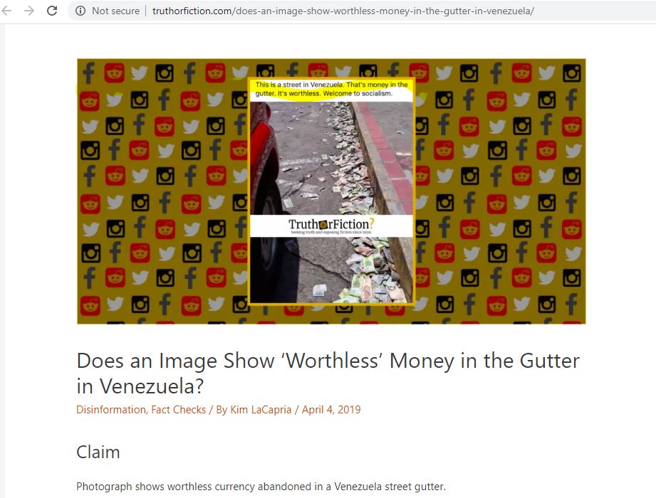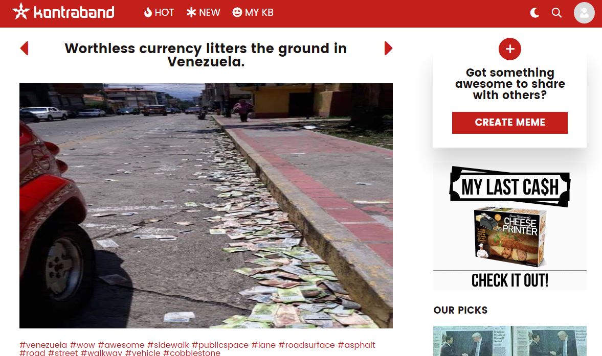 यो एक भेनेजुएला सडकको नालीमा फालिएको बेकारको पैसाको वास्तविक फोटो हो । यो मुद्राको बेकार भयो र भेनेजुएलाका बासिन्दाहरूले यसलाई बेवास्ता गरे भनेर पोस्ट गरिएको पाईएको छ ।