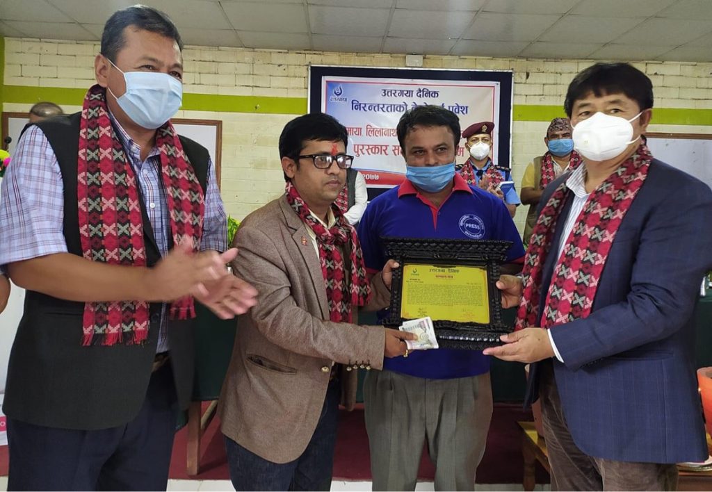 विदुर – नुवाकोटबाट प्रकाशन भईरहेको उत्तरगया दैनिकले आफ्नाे तेस्राे वर्षकाे निरन्तताकाे अवसरमा कृष्णमाया, लिलानाथ स्मृति क्रियाशिल पत्रकारिता पुरस्कारबाट पत्रकार देवचन्द्र भट्टलाई सम्मानित गरेकाे छ ।
