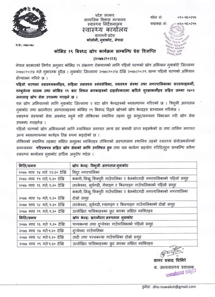 स्वास्थ्य कार्यालय नुवाकोटकले पनि जिल्लामा खोप अभियानको लागि मङ्गलबार प्रेस विज्ञाप्ति जारी गरेर यहि माघ १४ गते मध्यान्ह १२:३० बजे विदुर नगरपालिकाबाट सुरु गर्ने उल्लेख गरेको छ ।