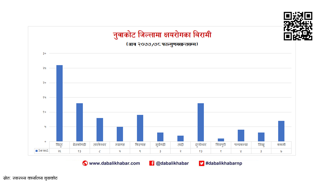 १२ वटै स्थानीय तहरुको तथ्याँकमा सबैभन्दा बढी विदुर नगरपालिकामा २६ जना क्षय रोगका बिरामी रहेको तथ्यांक छ । यस्तै, बेलकोटगढी र दुप्चेश्वरका १३/१३ जना, किस्पाङका ९, तारकेश्वरका ८, ककनीका ७, म्यागङका ५, पन्चकन्याका ४, लिखु र सुर्यगढीका ३/३, तादीका २ र शिवपुरीका १ जना क्षयरोगका बिरामीले डट्स प्रविधिबाट उपचार गरिरहेको छ ।