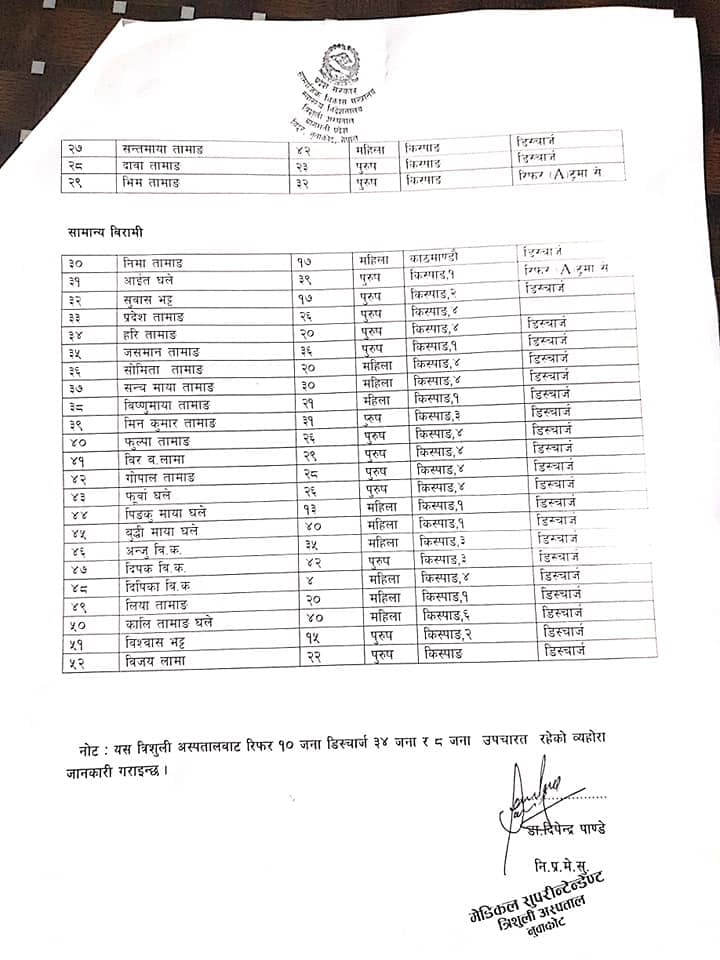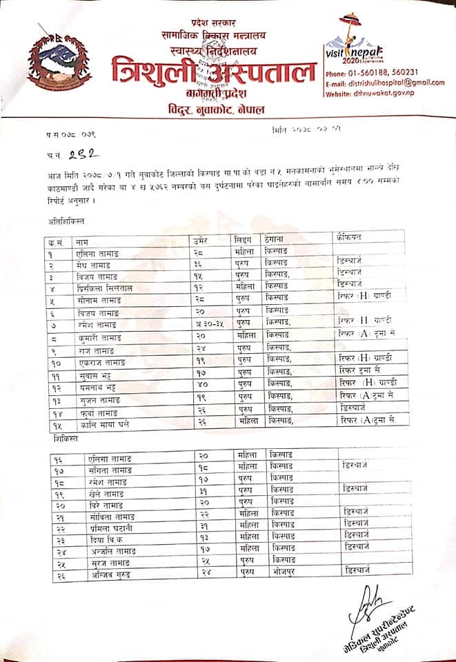 त्रिशुली अस्पतालका प्रमुख डा. दीपेन्द्र पाण्डेका अनुसार दुर्घटनामा परि अतिअशक्त १५ जना, सिकिस्त १४ जना र सामान्य घाईते २२ जना रहेको छ । जसमा १० जना अन्यत्र रिफर, डिस्चार्ज ३४ जना र उपचारत ८ जना रहेको छ ।
