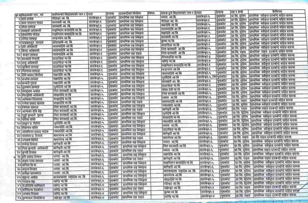 नुवाकोट – तारकेश्वर गाउँपालिकाले काज सरुवा भएका शिक्षकहरूलाई रमाना दिन र हाजिरी गराउन अटेरी गर्ने विद्यालयका प्रधानाध्यापकहरूसँग स्पष्टीकरण मागेको छ । गत साता गाउँपालिकाले ८६ जना शिक्षकको काज सरुवा गरेकोमा केही विद्यालयले सरुवा कार्यान्वयन गर्न अटेरी गरेकाले सात दिनभित्र चित्त बुझ्दो कारण सहित स्वयं उपस्थित भई स्पष्टीकरण पेस गर्न प्रधानाध्यापकहरूलाई पत्र काटिएको गाउँपालिका अध्यक्ष शिव अधिकारीले जानकारी दिए । अध्यक्ष अधिकारीका अनुसार, अटेरी गर्ने शिक्षकहरूलाई पनि स्पष्टीकरण सोधी कारबाहीको प्रक्रिया अघि बढाउने तयारी भइरहेको छ ।